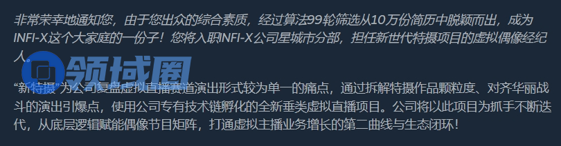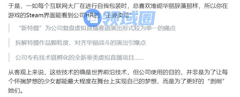 其实,从游戏的宣发上,就已经初见端倪。官方从最初就用一大串精妙绝伦的互联网黑话阐述了为何一家巨头会选择虚拟主播来赚钱,说实话第一次看的时候,居然立马引起了我的应激反应(师傅,别念了)。