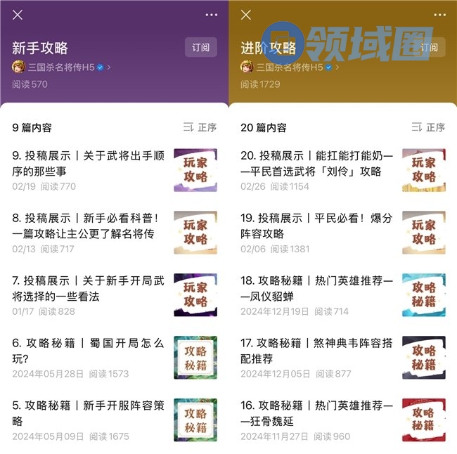 另一方面,为了进一步为用户提供交流的平台,同时降低用户对游戏理解和上手的门槛,《三国杀名将传H5》还围绕游戏的社区生态建设,建立起包含官方公众号、社群、微信游戏圈等渠道在内的玩家社区。通过持续策划和输出新手友好的游戏攻略、对赛事冠军等游戏KOL的专题采访等内容,同时结合策略游戏玩家最为关注的内容——攻略库的搭建,共创产出了上千条社区原创内容,以内容为纽带形成产品与用户、用户与用户之间紧密的链接。