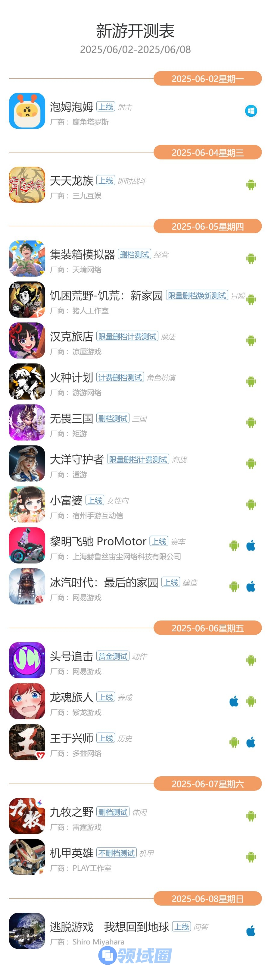 2025年6月2日—2025年6月8日的最新手游开测信息,共有17款游戏开测。以下是开测信息: