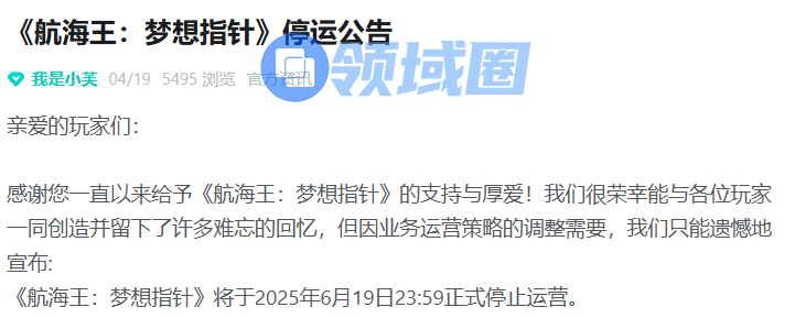 而在近几月,吉比特旗下雷霆游戏还相继宣布两款游戏的停运,分别为《不朽家族(代号:M66)》《航海王:梦想指针》。