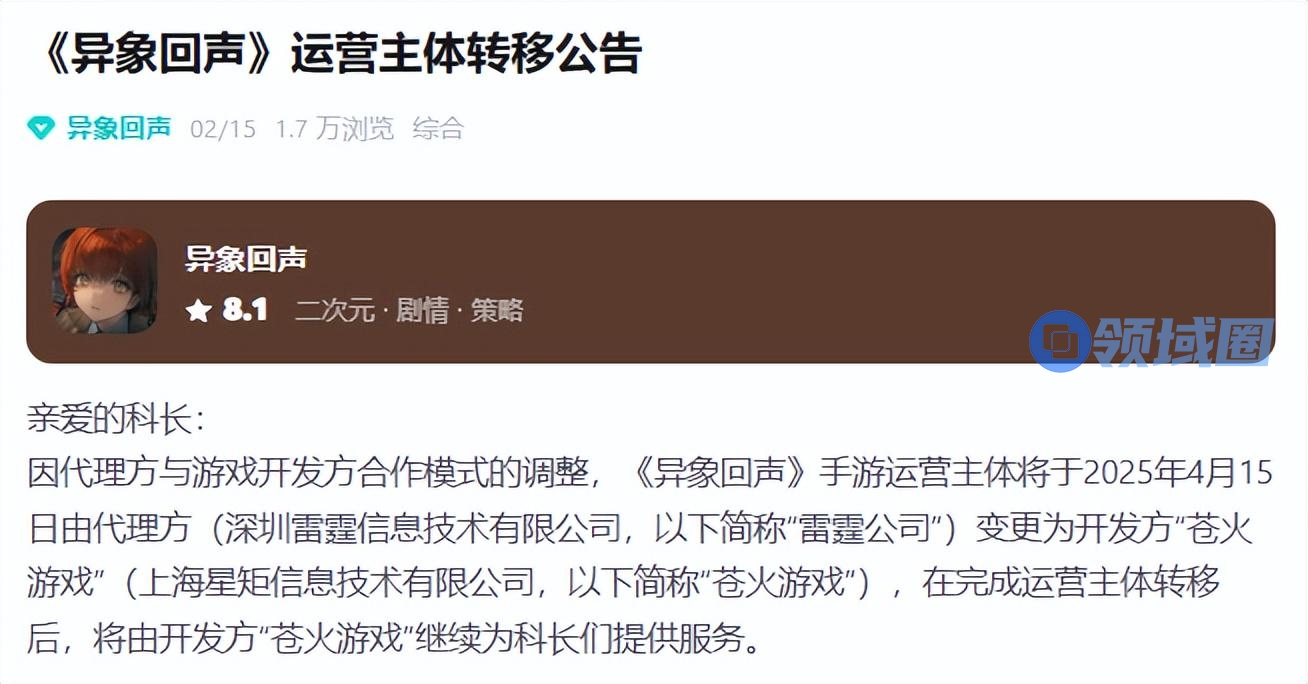 此外,今年2月,上线没多久,二次元游戏《异象回声》的发行权从雷霆游戏转交回开发方。