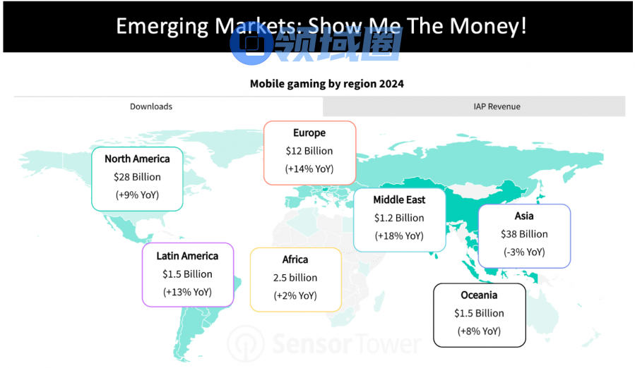 2024年,在拉丁美洲和中东地区,手游产品的内购收入同比增长了接近20%。这些新兴市场保持着上升势头,但整体规模仍然较小:拉美、非洲、中东和大洋洲的手游内购总收入还远远不如欧洲这个单一市场。