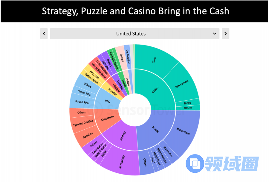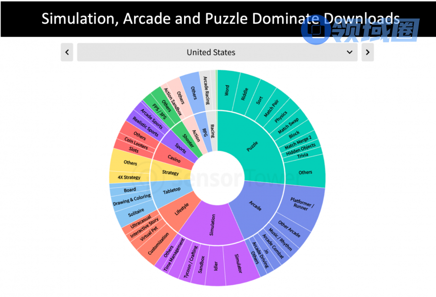 在美国手游市场,解谜、模拟和街机品类在安装量方面处于领先位置,不过,解谜、策略和博彩类游戏拿下了大部分收入。这种对比很有启发性。