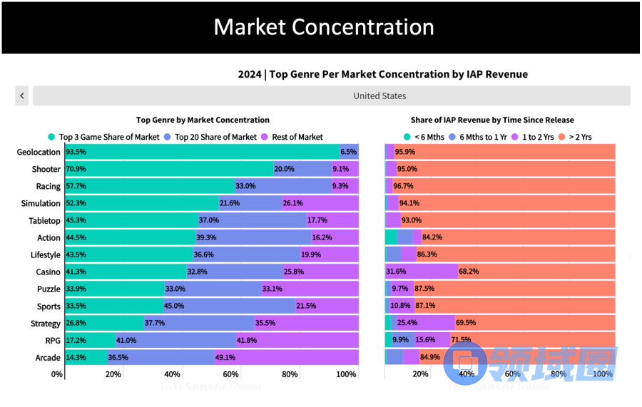 在部分细分品类市场,最畅销两款手游的营收,占市场总收入的比例达到了80%以上。随着时间推移,这个比例还在上升。