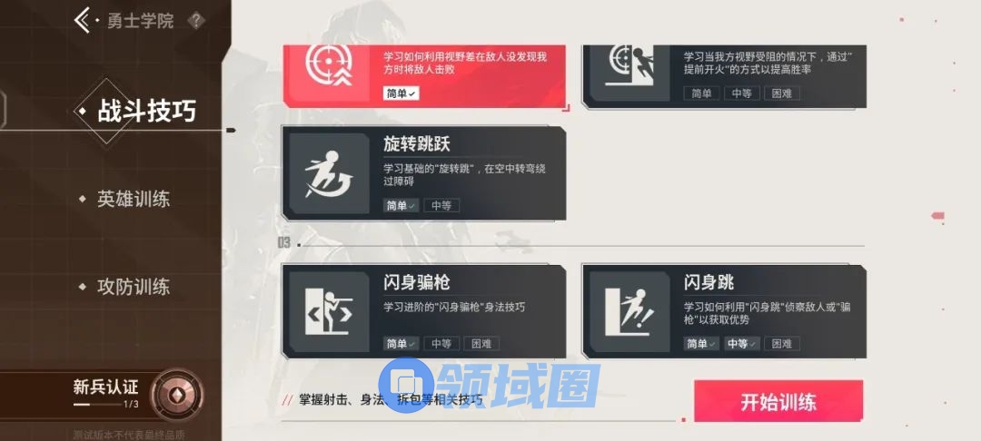 而且非常惊喜的是,《无畏契约手游》基于FPS的硬核操作玩法,提供了非常完备的战斗技巧合集——“勇士学院”。其中“预瞄”“优势视野”“闪身射击”等战斗技巧和身法教程,经过亲身体验,对射击新手真的非常实用。