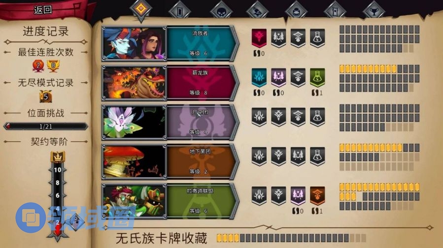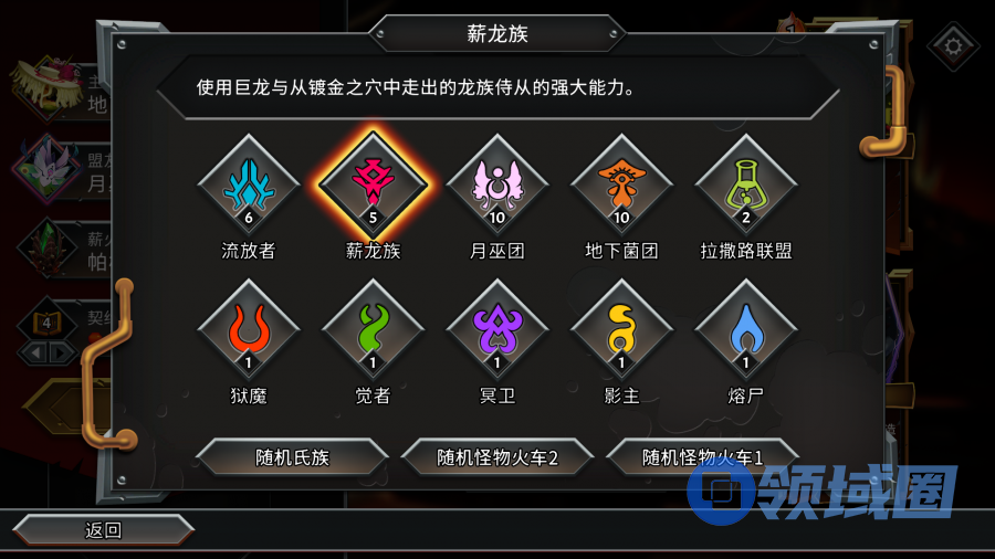 《怪物火车2》和前作的一个不同在于,2代提供了五个全新的氏族,分别是流放者、薪龙族、月巫团、地下军团和拉撒路联盟。每个氏族都有完全不同的战斗风格和两位全新的勇者,例如流放者(天使)的特点是可以用“英勇”(增加攻击力,每回合叠盾)和位移机制来造出强大的单位消灭敌人。薪龙族可以走龙蛋宝藏流和溶胶易伤等流派,月巫团有特殊的月相变化机制和大量低费高质量法术,地下军团(蘑菇人)擅长dot腐蚀,拉撒路联盟则更是有很多新活:药水调配、武器嫁接、低血线自动斩杀(不稳定性)等全新的机制。