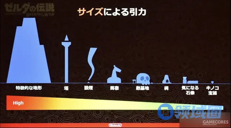 《塞尔达传说旷野之息》中还会区分不同的POI对玩家吸引力强弱来摆放这些引导玩家的点