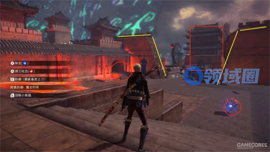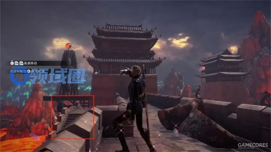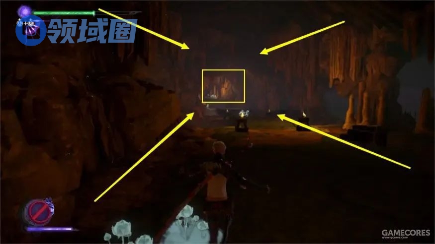 当玩家完成第一个区域的战斗与探索后,会自觉的往高塔方向前进,进而发现红框中向下的楼梯