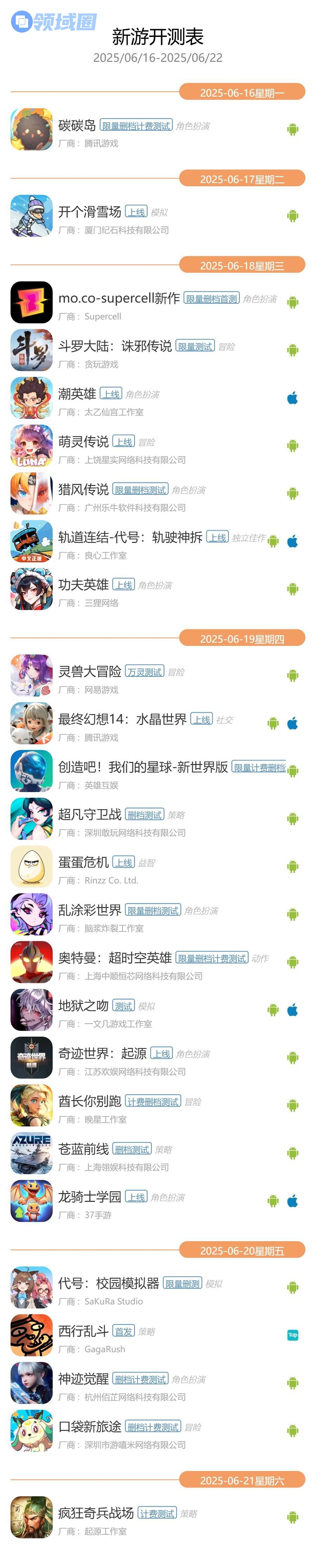 2025年6月16日—2025年6月22日的最新手游开测信息,共有26款游戏开测。以下是开测信息: