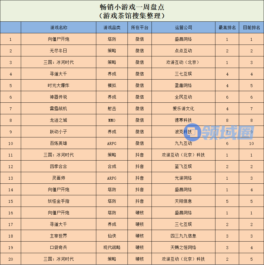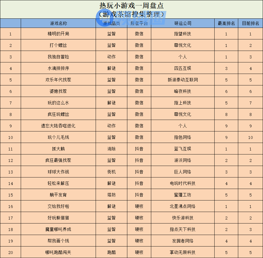 休闲新游周报每周统计微信小游戏、抖音小游戏、硬核小游戏以及App Store和Google Play上的新游爆款,并按照分类制作表格,将游戏排名情况等信息进行整理,希望给到行业同侪帮助。