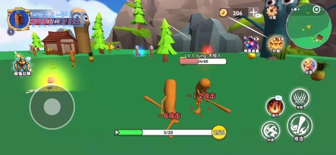 不过比起玩法,更值得关注的这两款游戏选用的题材和包装,正是当前在国内外热度都非常高的“AI山海经”。“AI山海经”系列指的是一批以AI生成的、以无意义词汇拼接为名的荒诞生物,这其中就有两款游戏中的初始形象——手持棒球棒和突兀的五官组合的木棍人“Tung tung tung sahur”,还包括耐克鞋鲨鱼、轰炸机鳄鱼等等。