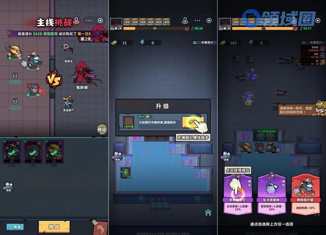 玩家在进入游戏后,需要进入一个房间,躺在床上赚得金币,赚得的金币可以用来升级床铺-提升金币增长速度,升级门-提升防护生命值,还可以选择“召唤”-触发肉鸽选项,召唤一位神将或者提升神将属性,来组成输出阵营,用以抵抗从屏幕上方源源不断出现的鬼怪攻击。微恐题材和塔防肉鸽玩法在吸量方面都有突出优势,两者的融合成功推动这款游戏挺进了畅销榜TOP5。