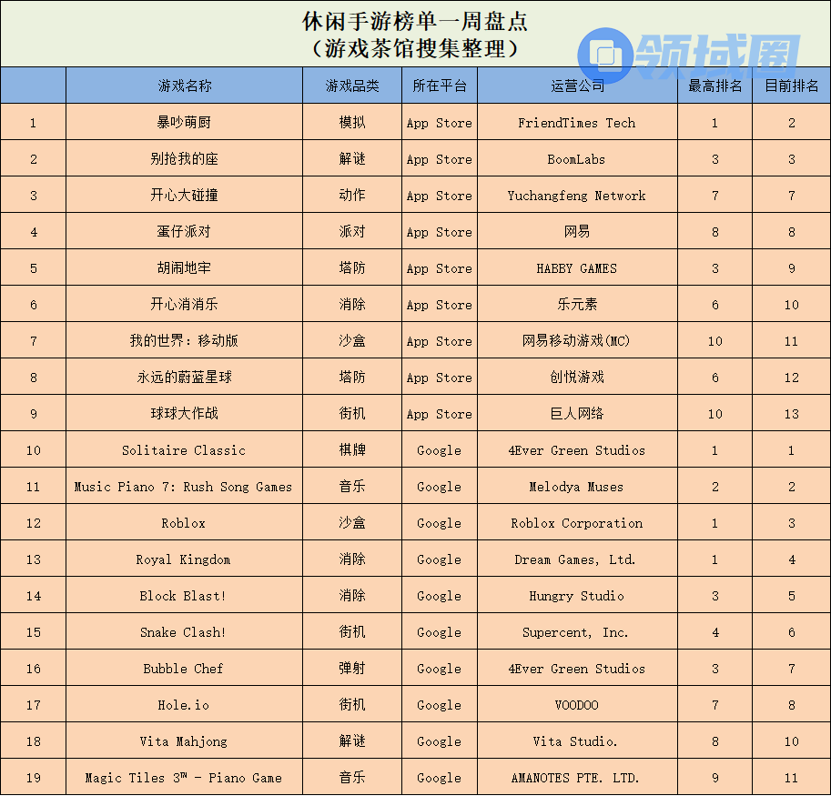 沙盒平台《Roblox》再次登顶魁首,Dream Games的三消新游《Royal Kingdom》和国产消除游戏《Block Blast!》分别位于榜单第2和第3名。弹射游戏《Bubble Chef》本周最高也冲上了免费榜TOP3,且其当前位于榜单第7名。