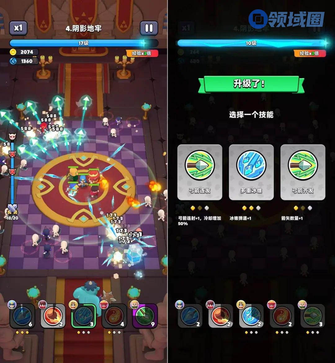 从玩法上来看,该游戏依然符合海彼打造爆款的经典公式,即“低门槛核心玩法+轻度肉鸽+中度外围养成”。其中的核心玩法以放置塔防的形式呈现,关卡开始后,玩家选取的英雄将站在对局中央,怪物将从四面八方逼近,中间的英雄会自动攻击,抵御这些怪物,击败怪物的同时玩家可以积累更多经验,用以触发肉鸽选项召唤更多英雄,或提升英雄属性,来应付更加强大的敌人。