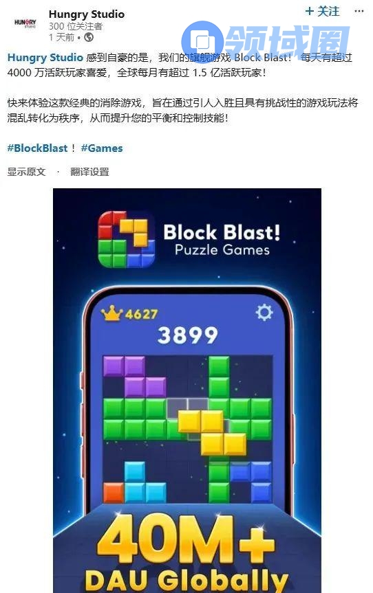 就是这样一款简单的消除游戏,却备受全球玩家青睐,自2022年上线以来便长期稳坐全球下载手游榜单TOP10。2024年11月,研发商Hungry Studio官宣,该游戏DAU正式突破4000万大关,MUA更是达到了惊人的1.5亿。
