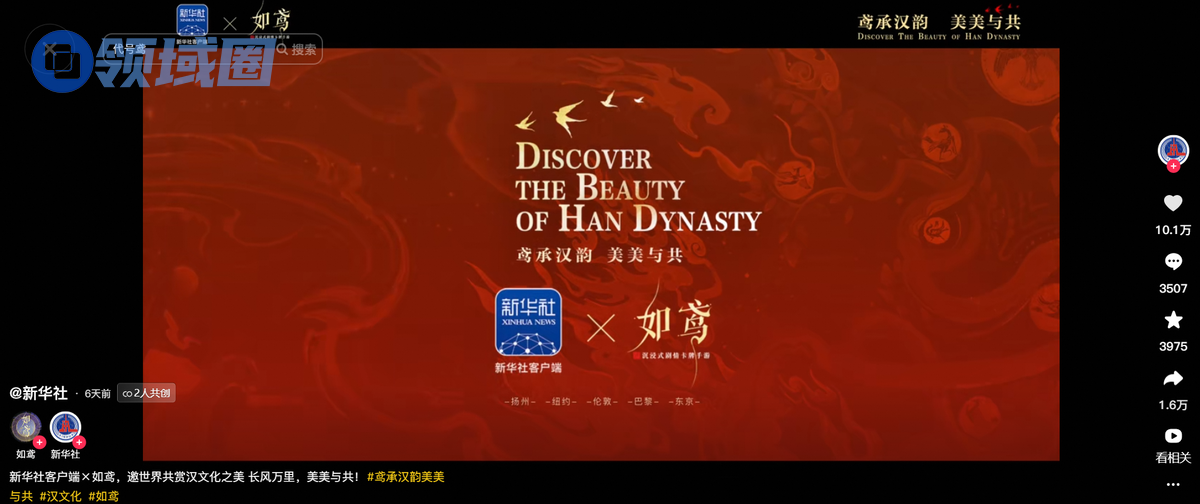 6月11日,《如鸢》联合新华社发布了一则“鸢承汉韵,美美与共”的汉文化主题宣传视频,通过记录文化传承人、爱好者的工作侧写,与他们对话,展现出红雕漆、古琴、汉服、傩舞等汉文化的内涵和深厚底蕴,再经由主流媒体的强大传播力触达更广泛的年轻受众。