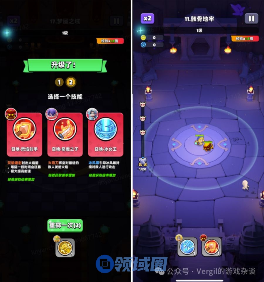 - 英雄的技能设计与BUFF属于思路常规,但在肉鸽领域猩球多年的积累,让数值投放和落地效果非常稳扎,尤其是战中的三选一,搭配多种技能品质的切分,在前期游戏还是能为玩家提供选择空间的