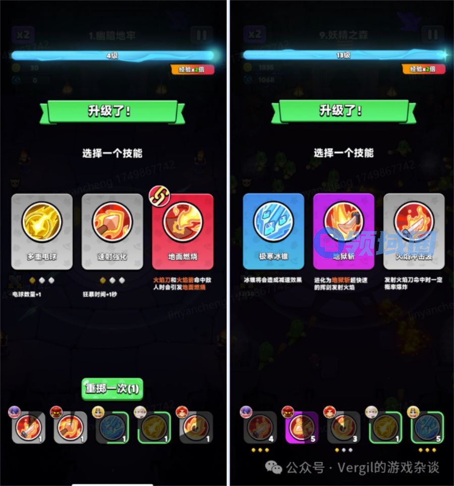 玩家拾取一定数量的经验会升级,并触发三选一BUFF: