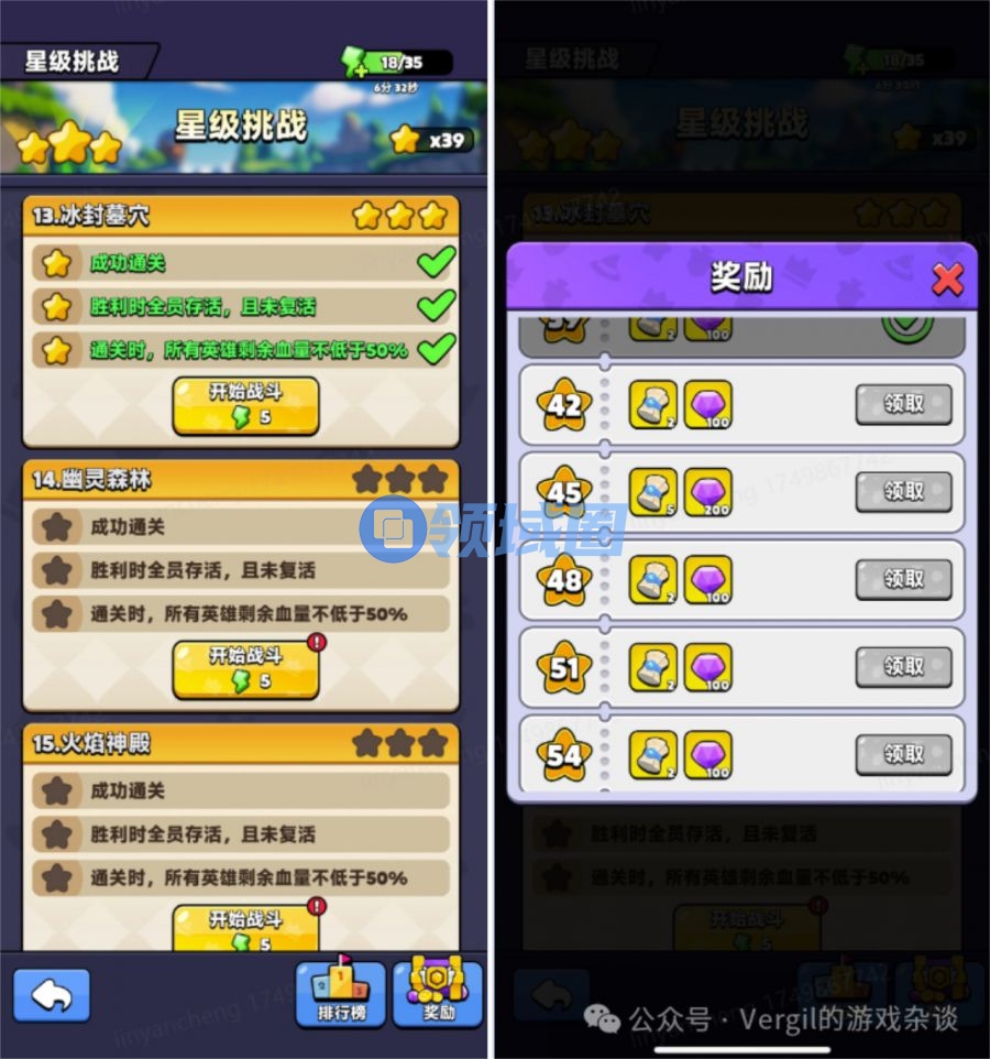 - 每关有三星挑战,根据星级领取招募券和钻石作为一次性奖励