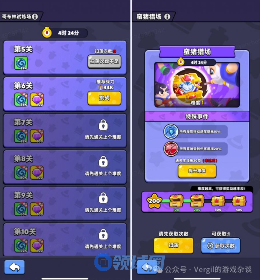 - 玩法:主线副本,星级挑战,每日挑战(硕鼠金洞、哥布林试炼场、蛮猪猎场、BOSS挑战赛、深渊远征、符文之地)等
