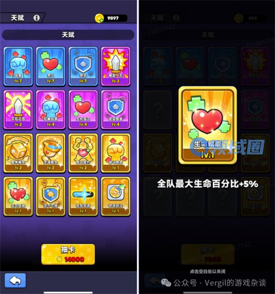 - 消耗金币进行一次抽卡,随机解锁 / 升级一项天赋