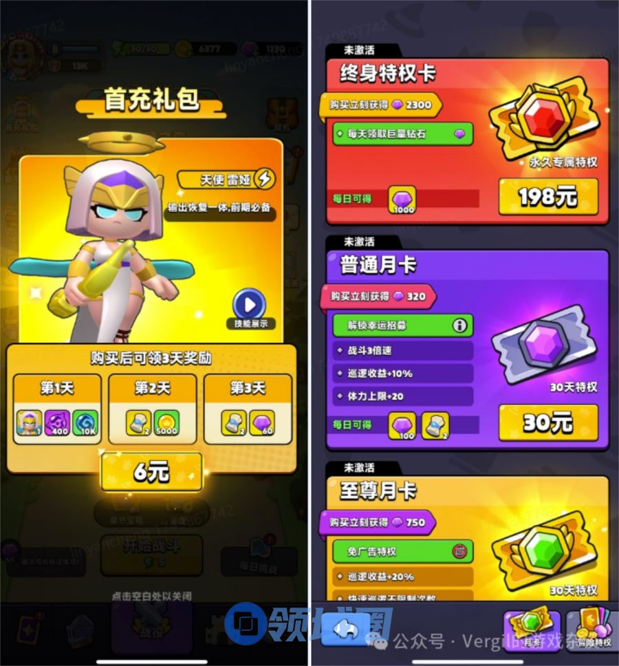 - 以最高性价比且限时的首充破冰,再用各种高性价比 + 时长限制且附带特权(主要是提供便利,比如免除广告、提升挂机收益、增加体力上限等)的权限卡,预设小R的付费档,同时将资源获取速度与无氪玩家逐步拉开差距