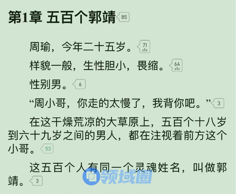如上图的《五百个郭靖》就是一个废柴周瑜拥有五百个听话但来自不同平行世界的郭靖的小说,五百个郭靖这个概念自然可以引发出很有意思的剧情。