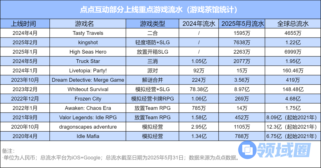 不过对于点点互动来说,随着《Whiteout Survival》国服去年出现在手游榜首和小游戏榜单前列,今年3月在手游全球收入榜登顶,它也正式补全了点点互动自研方向之“创意策略游戏”。