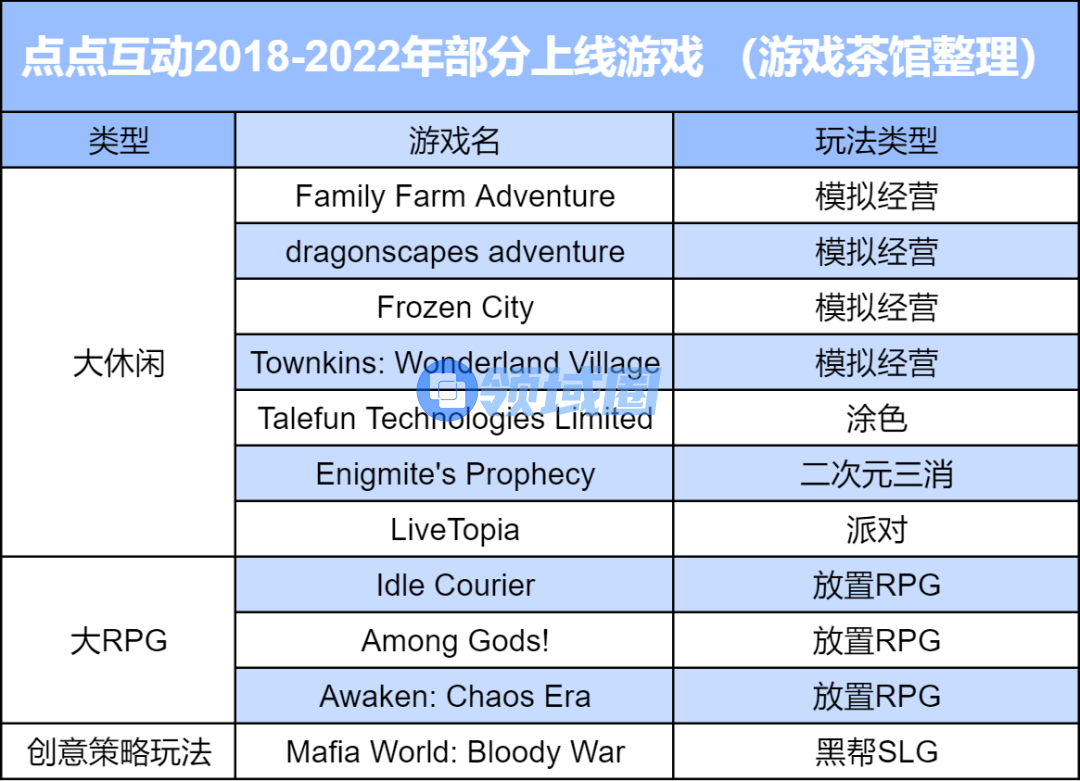在陈琦带领下,2019年,点点互动重建自研自发体系,跳出熟悉休闲品类,多点开花。结合陈琦接受采访在2021年透露的三大方向——大休闲、大RPG、创新策略游戏——截至2022年底,点点互动共推出超15款游戏。
