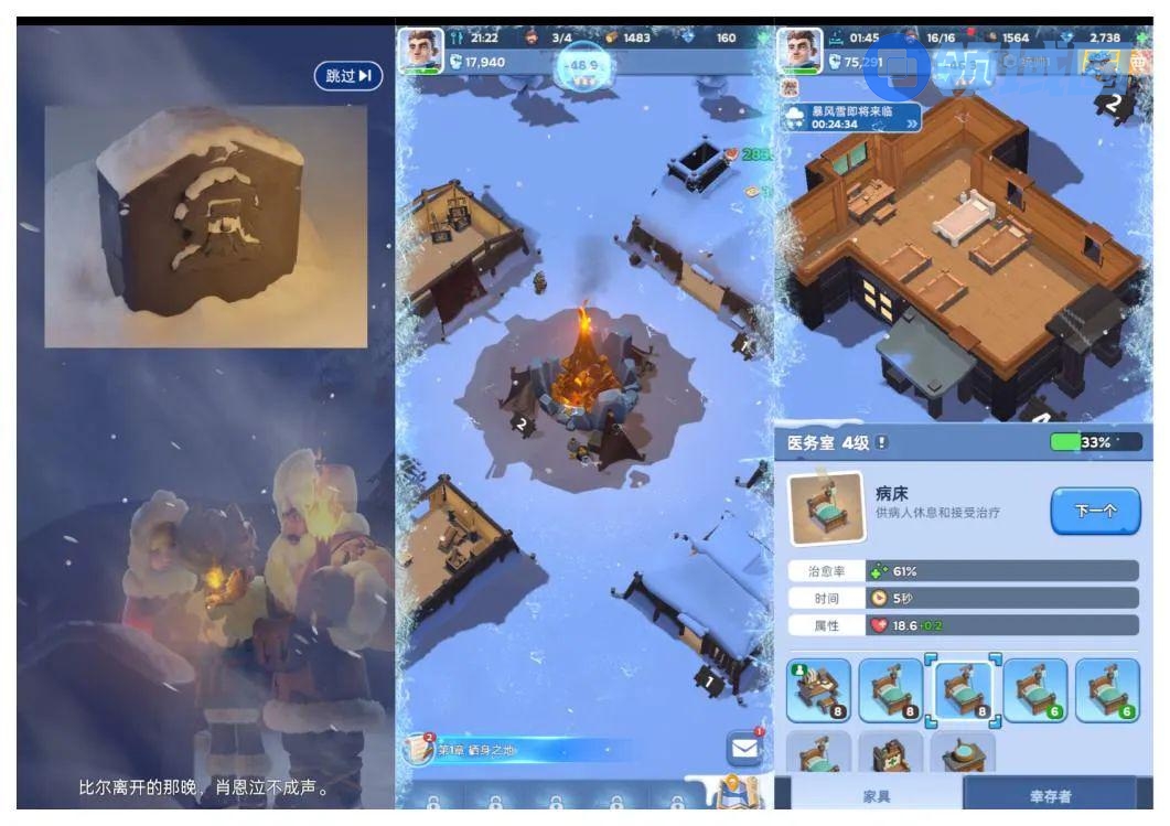 打开《Whiteout Survival》便能充分体会这点。团队首先将制作内容产品《菲菲大冒险》积累的叙事经验复用于新游中。游戏开篇便用冰雪围困人类的动画和暴风雪倒计时拉满紧迫感,瞬间将玩家卷入冰雪末日。