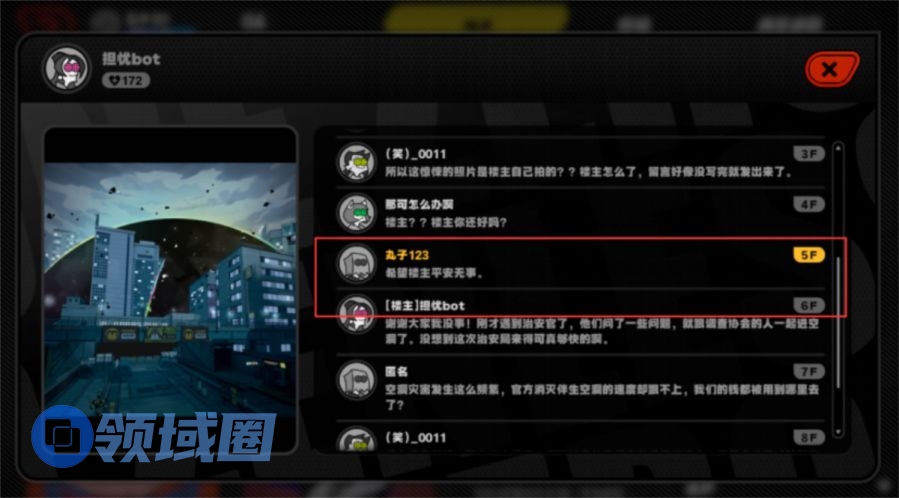 其次,游戏接受自由任务的界面还是按照数字化特点,做成一个带有大量信息同屏呈现效果的瀑布流匿名帖社区。这个界面不仅负责玩家相关的任务信息,还包含了大量这个时段游戏世界正在发生的事件与新闻,一方面提供世界观与叙事铺垫,另一方面,也跳出玩家视角,用去中心化的海量信息流去巩固玩家的一种认知,那就是除去玩家之外,整个世界依然在发生很多玩家不能参与的事件,世界并非围绕主角而转动。