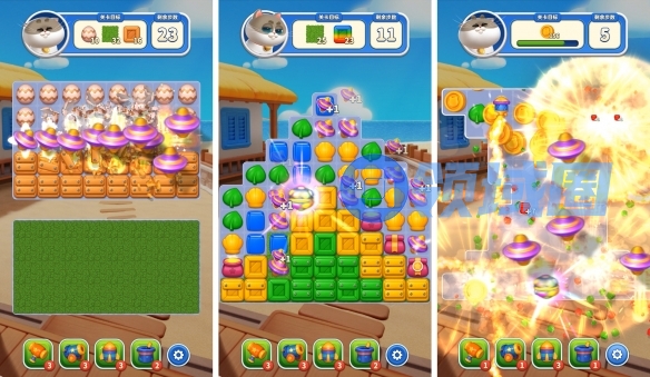 更有意思的是,陀螺还能和其他特效组合,升级为更高级的消除特效,对关卡内的消除目标进行“指向性爆破”。这就避免了传统消除关卡内,消除目标和可执行消除操作的区域相隔甚远时,玩家通常都会浪费很多操作步骤的情况,以此更进一步增强了消除爽感和连续闯关的解压体验。