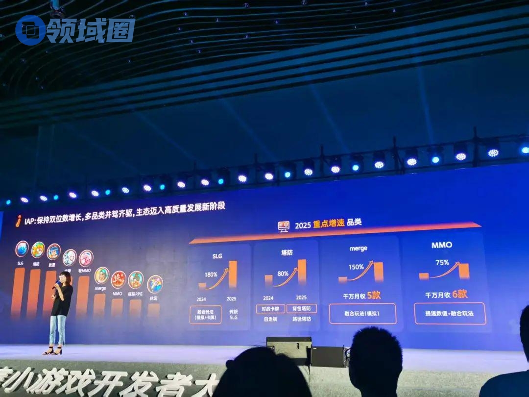 IAP小游戏市场增长比较突出的品类:SLG增长180%,塔防增长80%;merge增长150%,且千万月收的产品有5款;MMO增长75%,千万月收的产品也有6款。