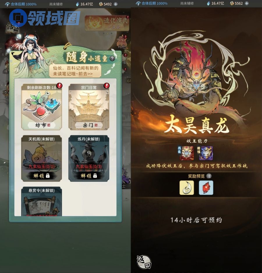 在上线4年的运营中,《一念逍遥》一边做减法一边做加法,减少了大量冗长的每日任务、简化了任务流程,比如说用小道童功能将炼丹、坊市、天机阁等日常任务集合在一起,降低了完成每日任务的耗时,为玩家省去了无意义的重复操作行为;并在部分活动上增加了预约即可自动参与的方式,进一步诠释放置理念。