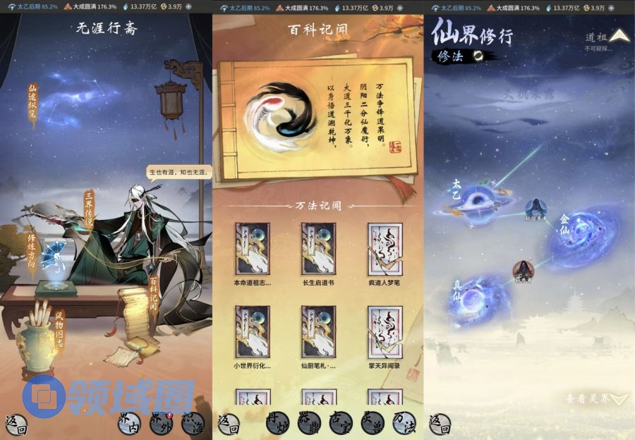 目前《一念逍遥》已经开放到太乙境界,从人界到灵界再到仙界,游戏也在不断填充剧情和故事线,加入关于古宝、灵兽、万法等百科记闻;关于世界观和人物故事的三界传说;关于修仙起源、民俗、文化、宗教的杂谈等等,并梳理了从人界到仙界的修仙脉络,形成了一套完整的修仙体系。