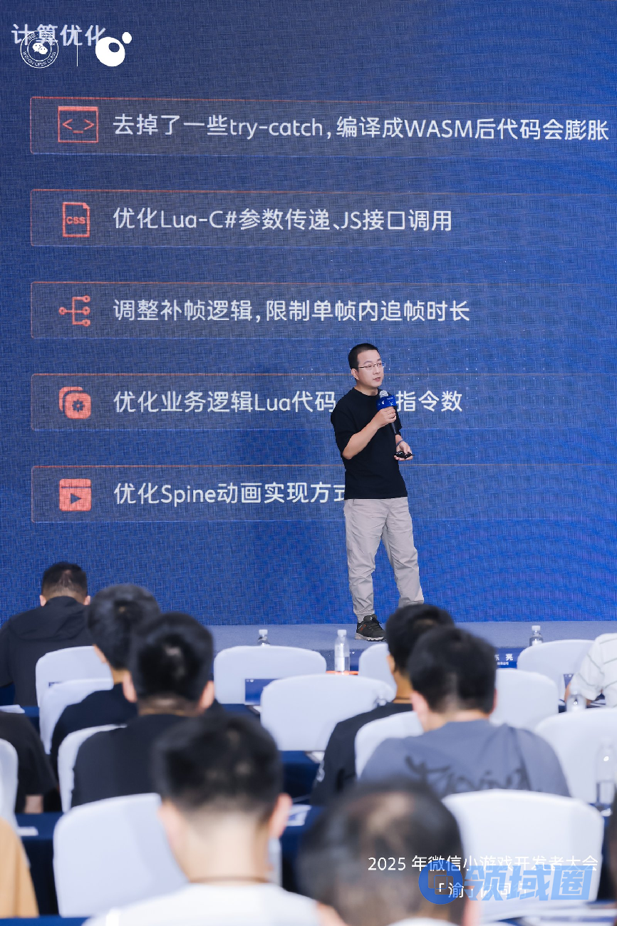 对内存优化的通用手段就是解决内存泄漏问题,因为刚才也提到了虚拟机套虚拟机,这几层的内存都需要精确控制,Lua也有内存泄漏的问题,GS也有。在初期的移植,我们以快为准,后期逐步迭代的过程中要解决大量内存泄漏的问题。以及资源按需加载,内存还是非常敏感的,压缩纹理格式、WASM分包,不管是提升加载速度也好、降低内存使用量都非常有帮助。对象池的使用,在游戏上GC的问题还是比较严重的。另外就是团结引擎对小游戏的导出也做了很多对标优化工作,所以团结引擎导出还是有比较大的提升效果。