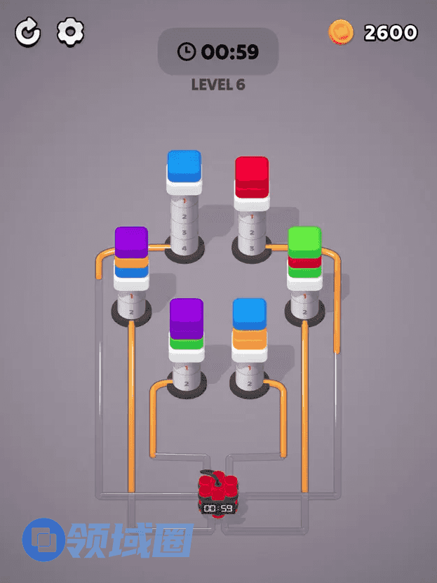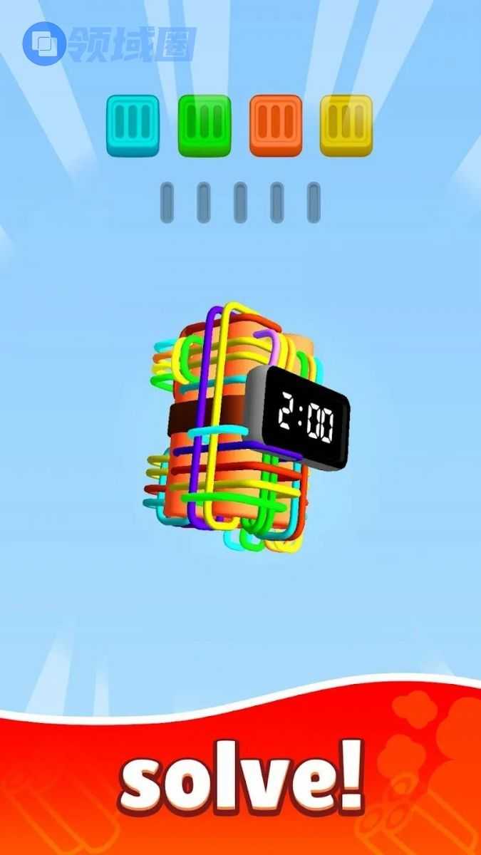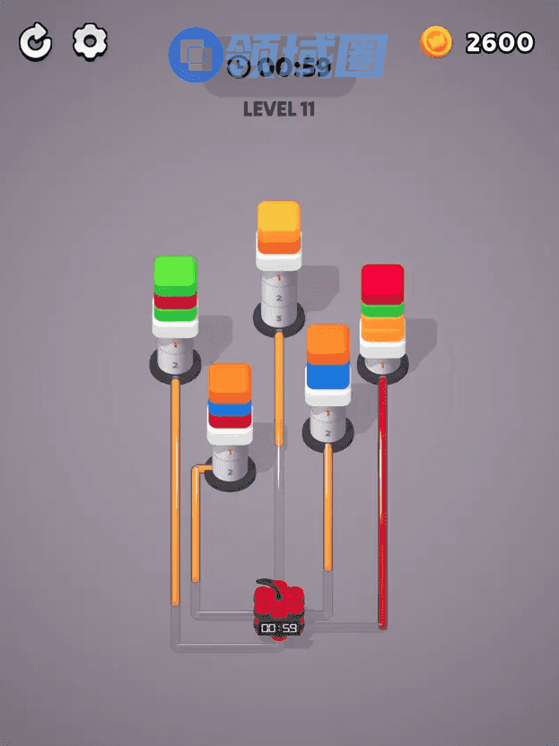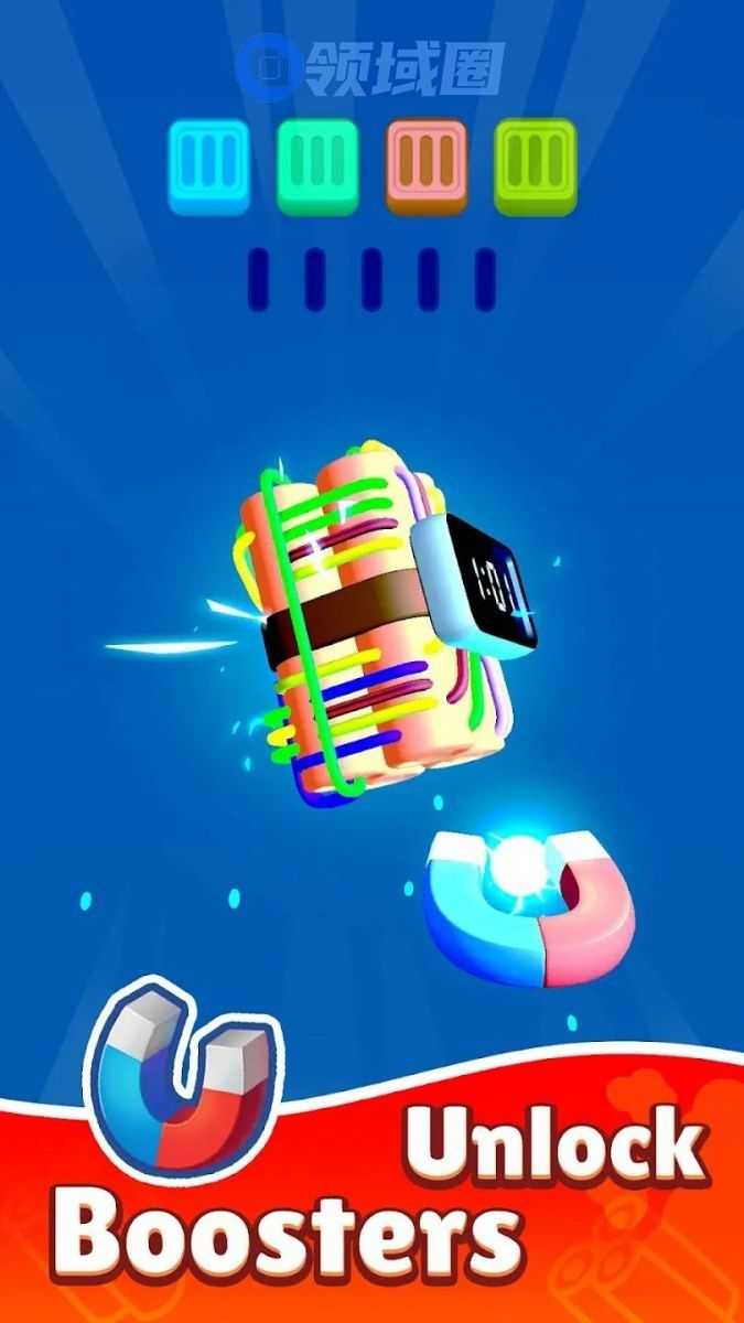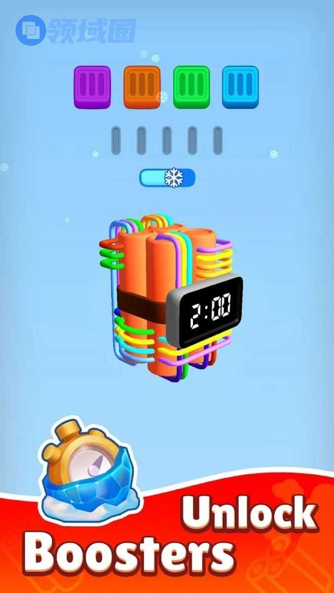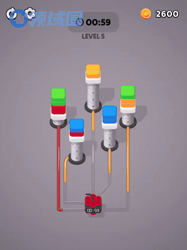 介绍:超出预期!,玩法是很常见的水排序,各个颜色的“砖块”需要放到各个台子上,创意的点在于利用“拆弹”的题材,和水排序的最大限制块数做了个融合,类似于其他游戏的“试管高度”“方块槽”高度一样,不过额外跟炸弹引爆做了链接,表现力很好,挺有意思包装创新。