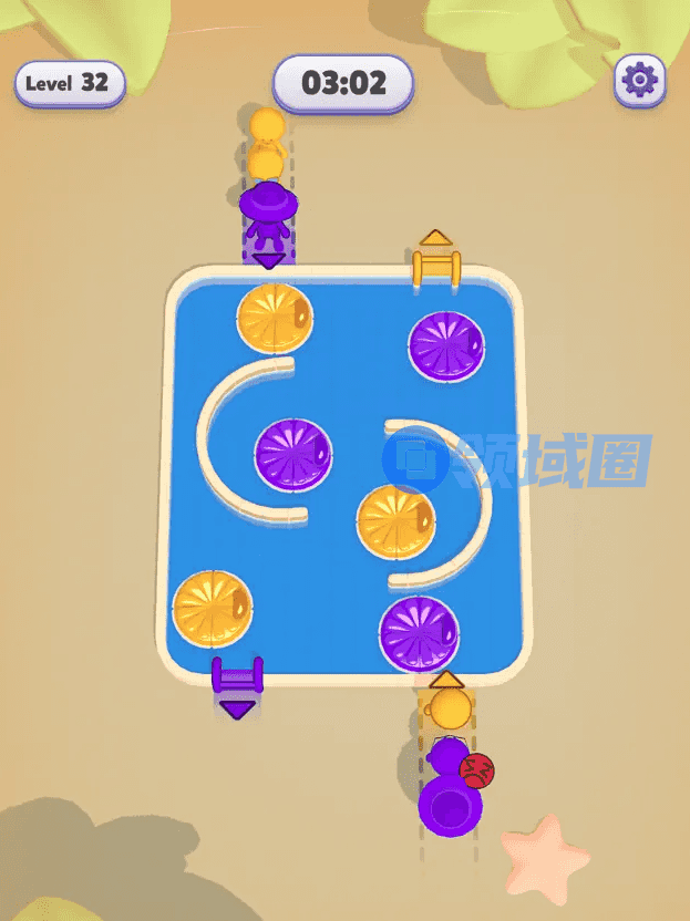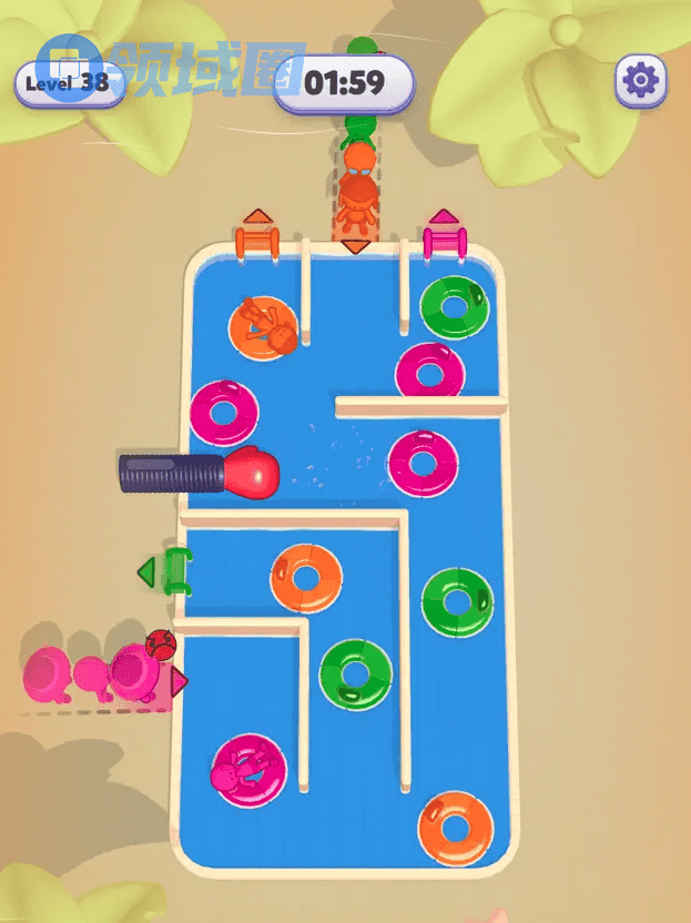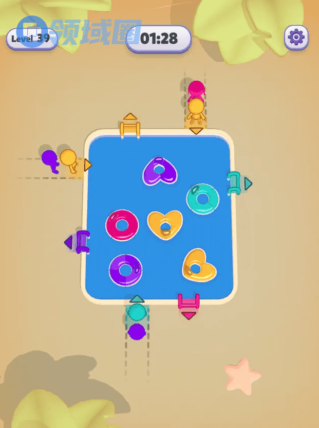 介绍:泳池各色游客+各色救生圈,用对应颜色救生圈接走游客,然后从对应梯子处送走,理解上还是挺简单的,玩法感受上跟Color Block Jam挺像的——限定区域内的各色图形移出地图的玩法。