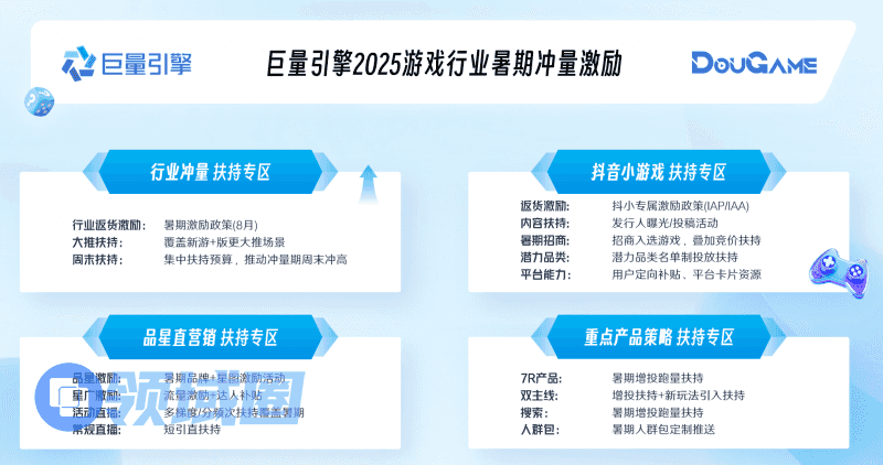 进入7月,巨量引擎在原有基础上再次加大扶持力度,面向小游戏与手游市场,持续创新产品,优化投放工具与转化能力,并推出一系列力度最大、覆盖最全的夏日激励方案:通过IAA与IAP双赛道专项激励计划,为重点及潜力游戏项目提供定制化投放方案和流量资源倾斜;同时,在版本更新、直播等多场景推出全品类、全周期激励政策,吸引更多优质内容创作者和投放者,助力游戏生态持续繁荣与增长。