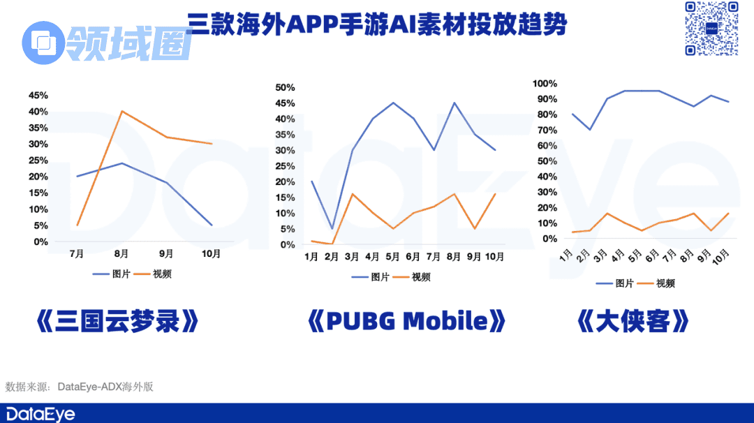 据DataEye-ADX检测,早在去年,腾讯、4399、天游网络、露珠游戏、冰川网络等出海厂商就已经开始加大AI素材投放力度,包括《PUBG》《菇勇者传说》《向僵尸开炮》《道天录》等在内的大热爆款的AI素材投放量均有显著提升。其中4399旗下MMO《大侠客》在东南亚市场投放的AI图片素材占比甚至一度高达90%。