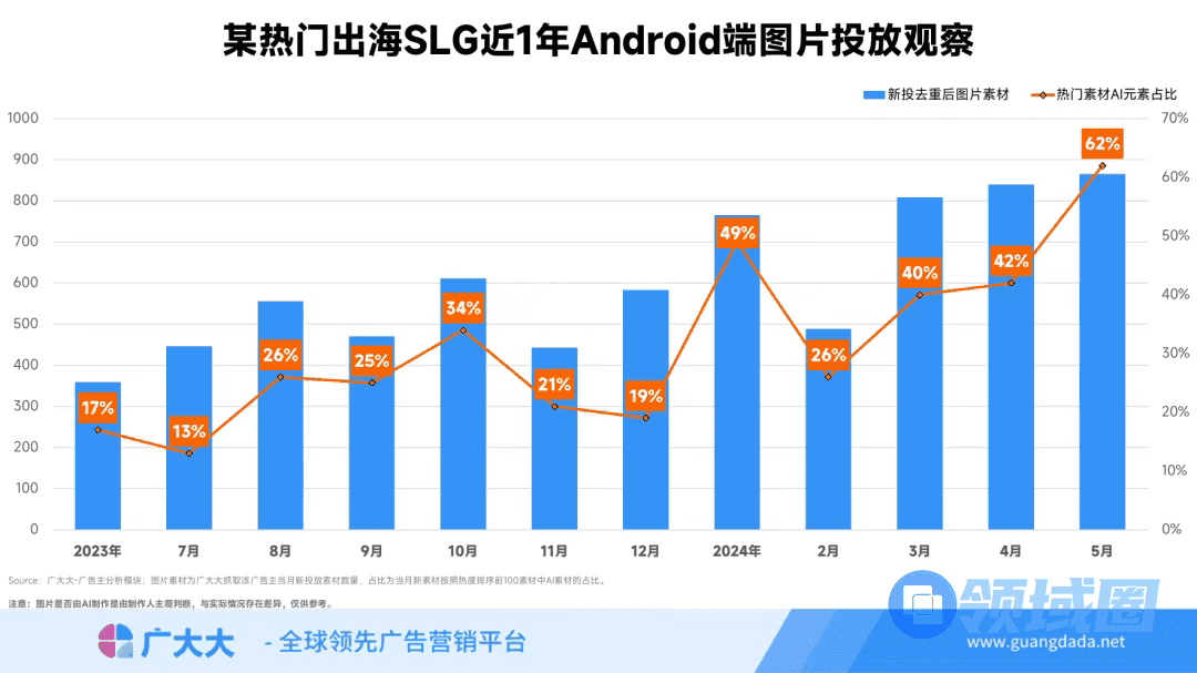 广大大在此前的统计中也提到,某热门出海SLG在24年,通过大幅增加AI图片素材投放占比,成功让每月新投素材数量实现倍增,从23年6月的不到400条增长到了24年3月后的800多条,且其中热门素材中的存在明显AI元素的占比也激增到了62%。