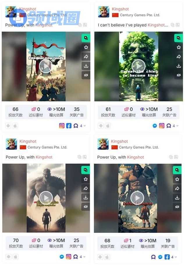 点点互动的新爆款《Kingshot》,则通过AI工具将不同画面风格、大小人物对比、“为帝国而战”设定和紧张的BGM等元素相结合,集中推出了大批曝光超千万的爆款视频素材。