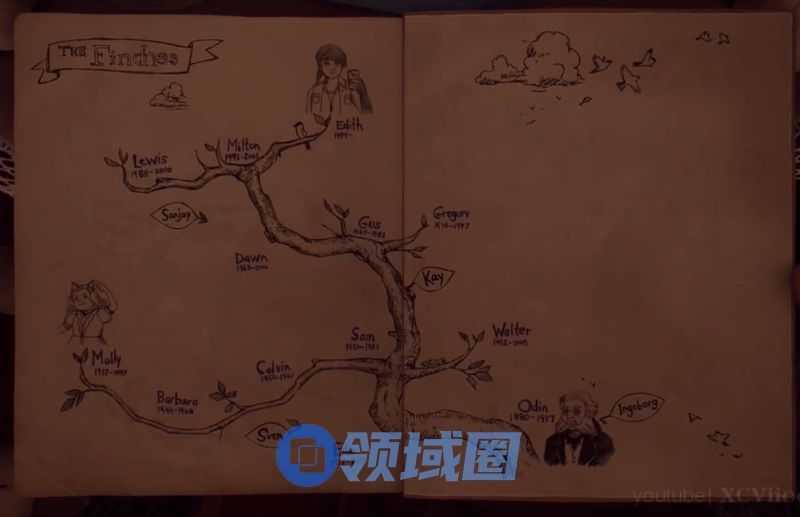游戏通过一根树枝来展示芬奇家的家族族谱,玩家通过不断去各个房间探索,收集探索每位家族成员的死因。
