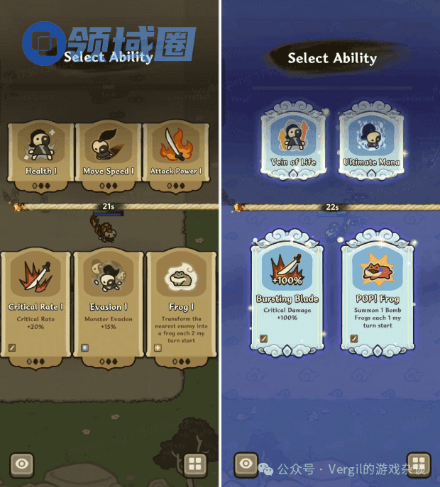 - 到达特定等级,解锁技能,每组技能为二选一装备