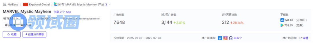 或许得益于整体精良的游戏品质及漫威IP的加持,游戏初期成绩不错。据官方公布,《MMM》上线当日注册量便突破了200万。而据点点数据估算,上线一周流水超1100万。这其中,或许便有不少IP带来的自然量。据AppGrowing国际版,网易漫威新游的素材投入量很温和。自今年1月,整体广告素材量为7648。在上线后,《MMM》日投素材高峰为2900。
