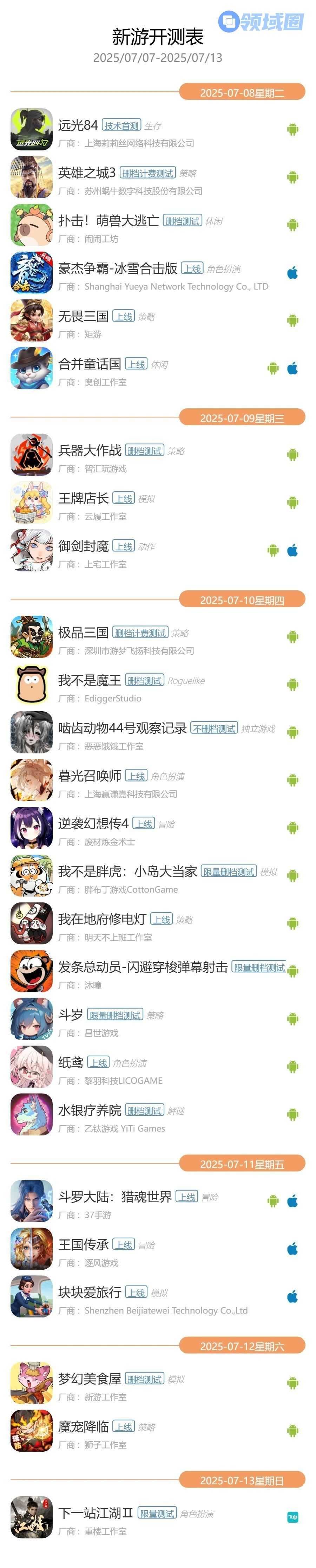 GameRes游资网统计了2025年7月7日—2025年7月13日的最新手游开测信息,共有26款游戏开测。以下是开测信息: