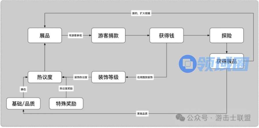 从双点博物馆的系统中我们看到,他是基于一个最简单的循环,基于每个节点进行发散设计,形成一个个子系统,再在各个子系统中构建更小的循环和爽感体验。