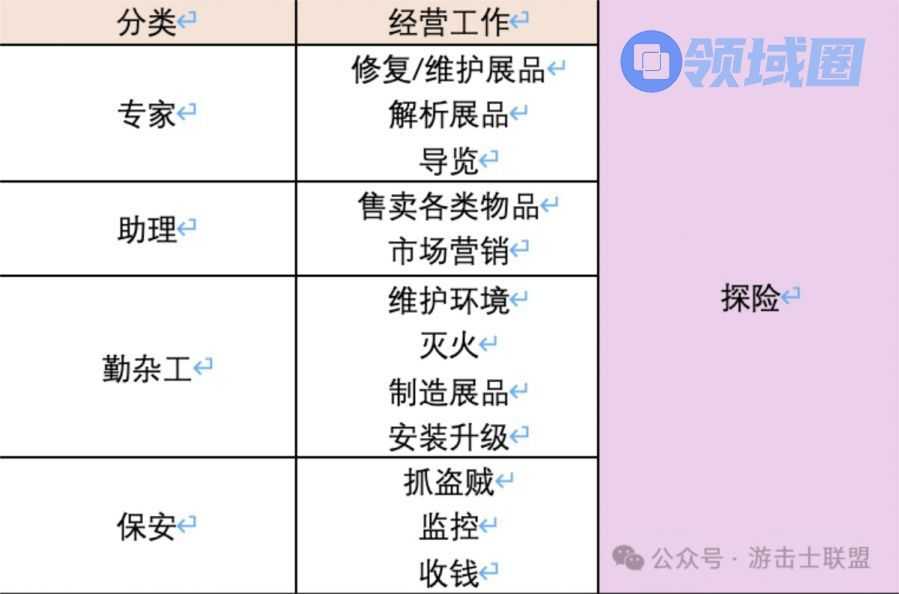前文提到过,展品需要动态维度的体验设计,员工可以服务于这个设计目标,同时在本作中,员工也是探险玩法的必要资源,从系统结构上看,员工串联了经营和探险的部分。