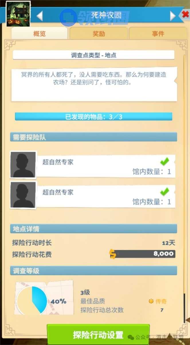 - 需要探险队:每个地点设定了需要探险队员工的数量和类型,部分地点还需要具有特定的技能或者特定的物品。这部分也激励的玩家对员工进行成长性投入。