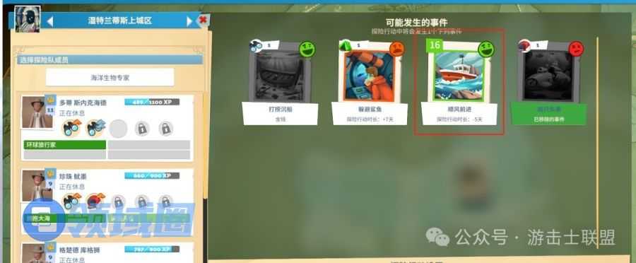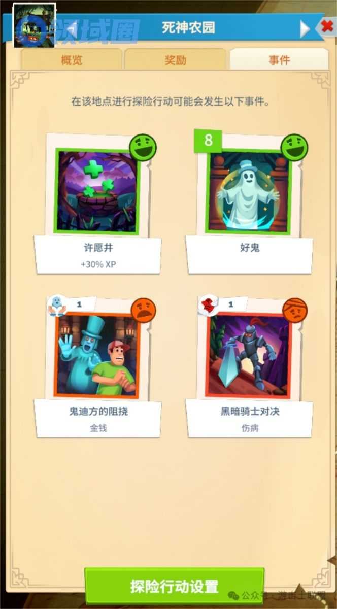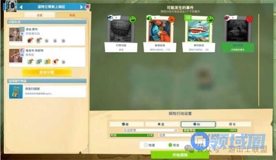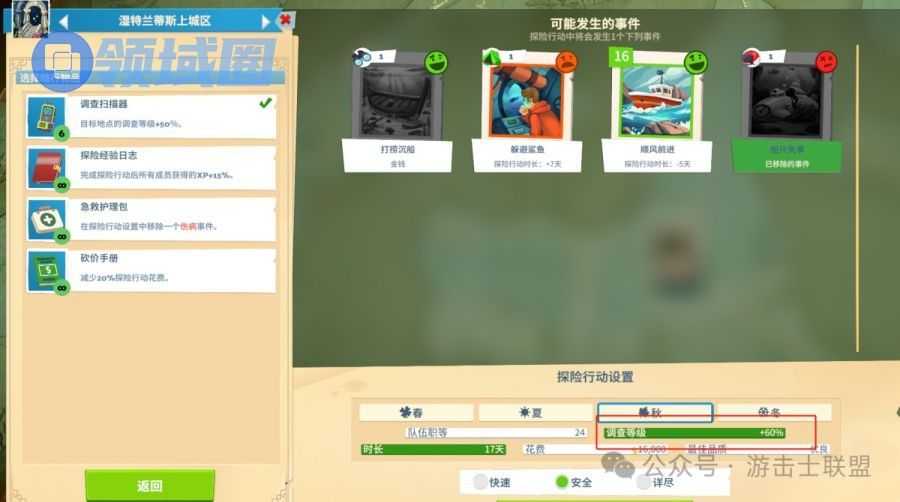 - 探索方式:探索方式分为快速/安全/详尽:三个方式所需的时长不同,获得的调查等级数值多少不一样,同时所遇到的事件卡也会有差别。